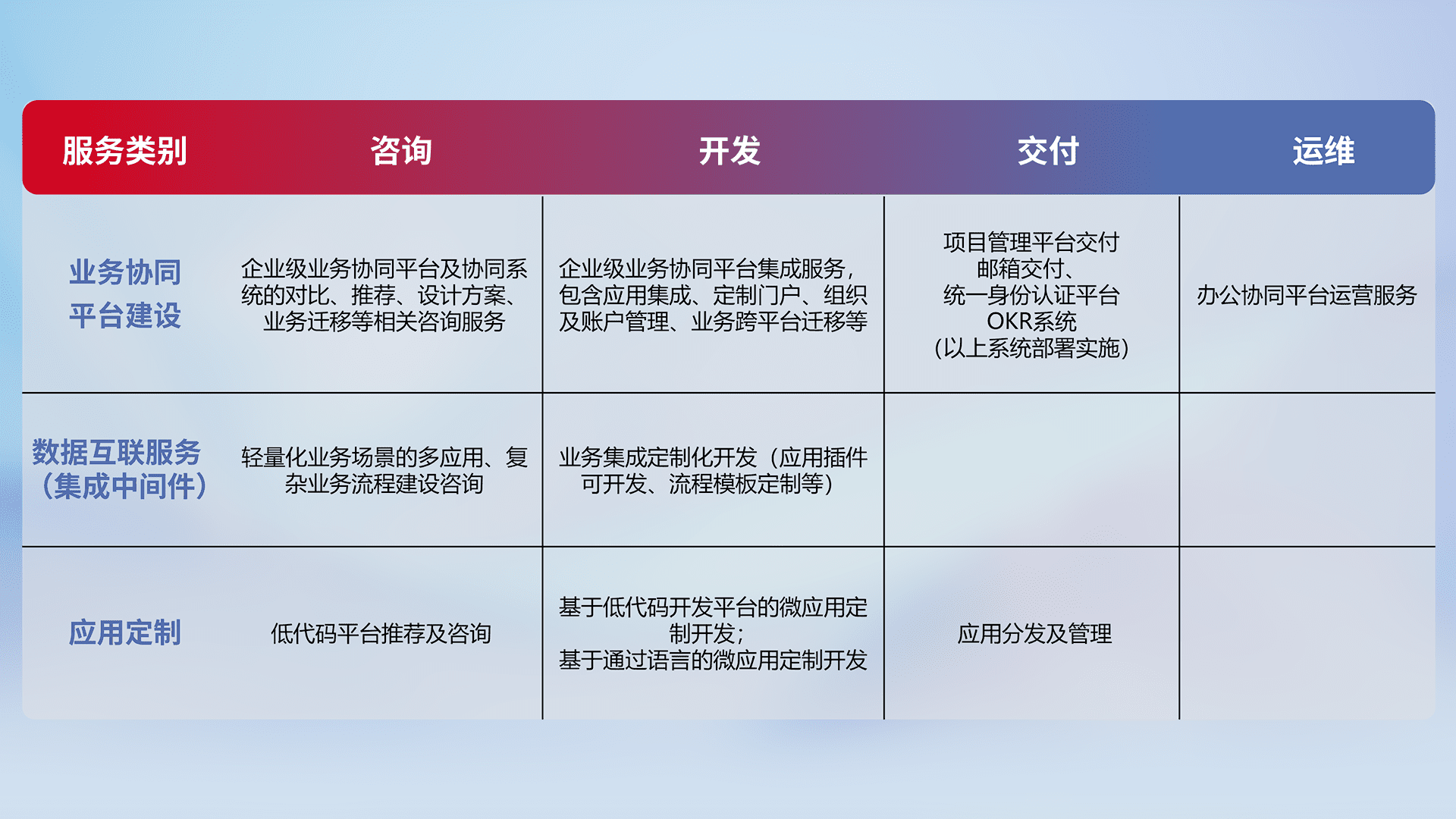 针对钉钉、、、企微、、IDaas等平台级产品提供产品的规划、、、、方案、、、、交付、、、定制化开发等服务,,实现如统一协同办公、、、、智能客户服务、、、混合会议管理、、、、智能数据查询、、等业务场景,,,,实现数字化转型。。。